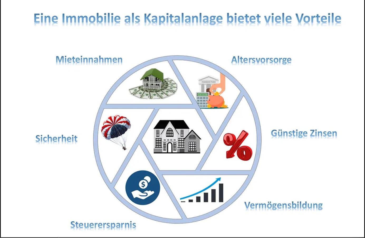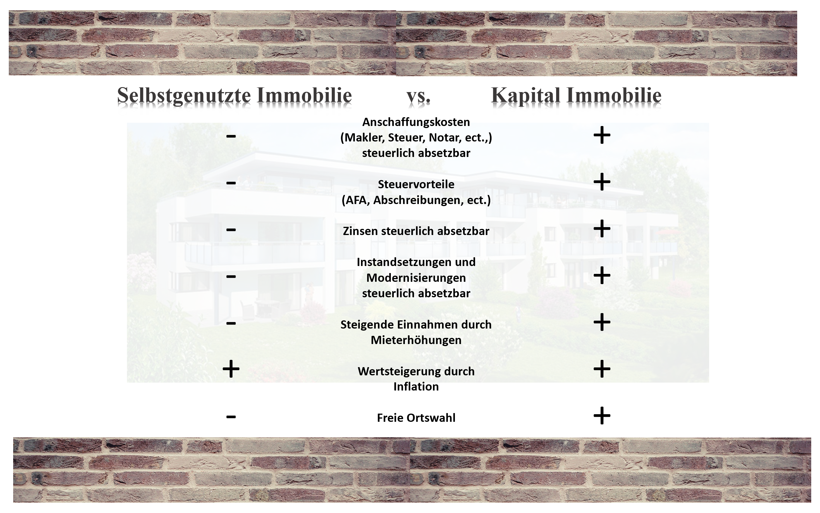 Ob als Anlageobjekt oder als monatlicher Immobiliensparplan, Immobilen gehören zu jedem inflationsgeschützten, steueroptimierten Vermögensaufbau dazu.