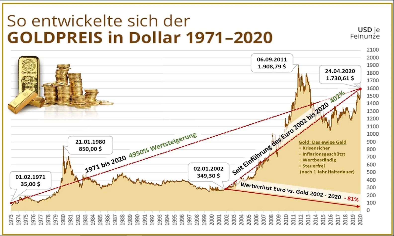 Seit Einführung des Euro legt Gold um 402% zu